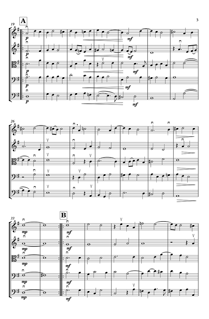 This Suite comes from his Newe ausserlesene Paduanen/Galliarden/Cantzonen/Allemand und Coranten ... published in Germany in 1609, and is the second suite in the book. Originally there was no key signature, as music at this time often had both modal and diatonic characteristics. In the 1600s, this music would have been played on viols or recorders or perhaps a mixture of instruments. All bowing, slurs, dynamics etc are editorial. The double bass part is the original bass viol line, with a few adjustments (octavations) to better accommodate its range.