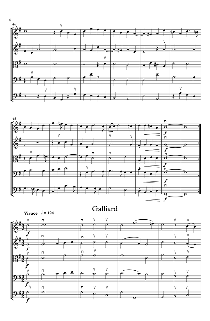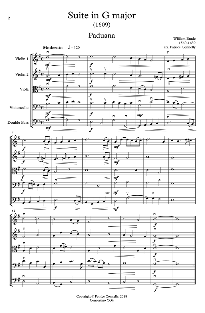 This Suite comes from his Newe ausserlesene Paduanen/Galliarden/Cantzonen/Allemand und Coranten ... published in Germany in 1609, and is the second suite in the book. Originally there was no key signature, as music at this time often had both modal and diatonic characteristics. In the 1600s, this music would have been played on viols or recorders or perhaps a mixture of instruments. All bowing, slurs, dynamics etc are editorial. The double bass part is the original bass viol line, with a few adjustments (octavations) to better accommodate its range.