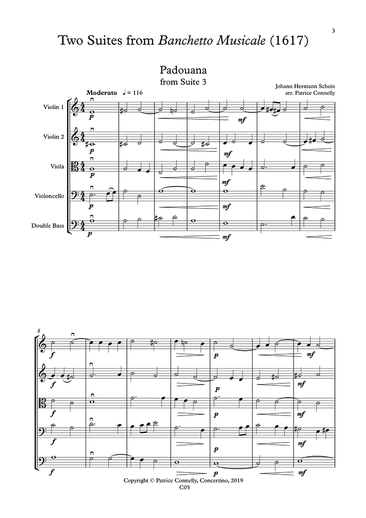 In this edition all note values are original, but modern clefs and barlines have been added. All dynamics, metronome markings, tempi and articulations are purely editorial and can be changed. The double bass part has been altered in most pieces, mainly by transposing up or down the octave to better fit the range of the instrument. But that part was the original bassline which Schein wrote.