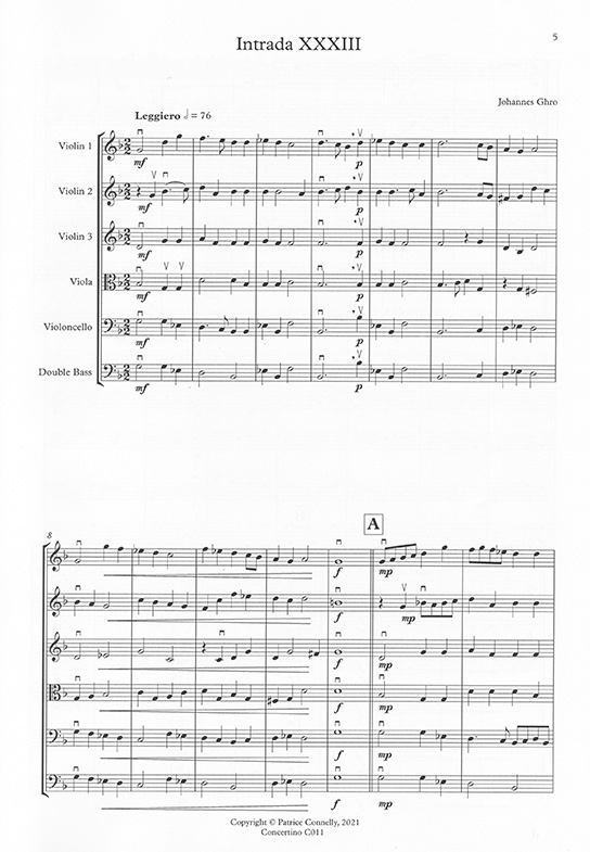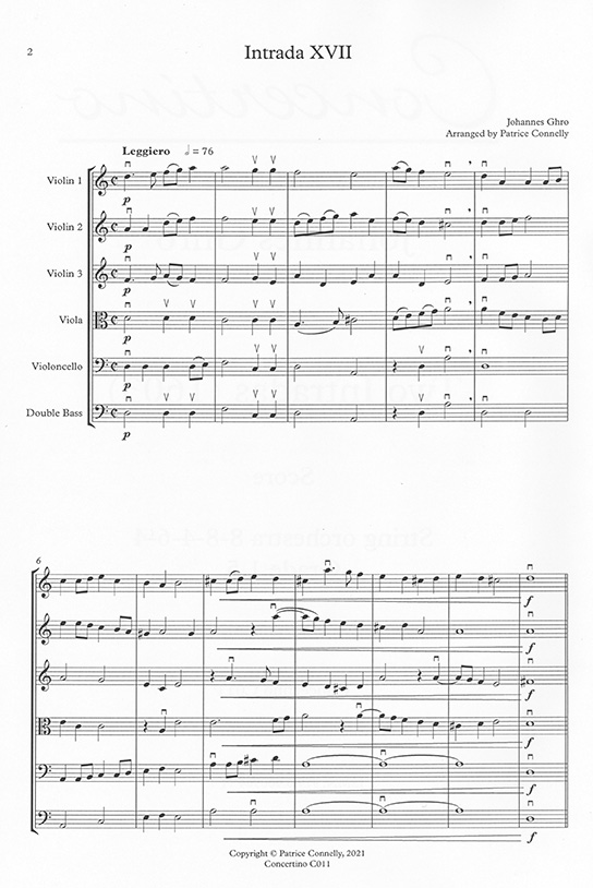These two intradas are from a collection published in 1603. They've been arranged for string orchestra, and include a 3rd violin part. They should be played lightly an in two. They would originally have been played by single instruments, so avoiding heaviness is important. Using smaller forces than a conventional orchestra is also possible.